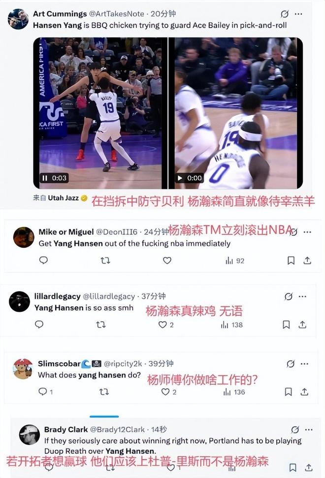 不到四分钟时间里,2分2次犯规,一次低级失误,对手六次挡拆配合打成了4次,这就是杨瀚森在这场比赛中的表现。对此媒体人吴頔发文表示,杨瀚森说是被人打成了ATM都不为过。对于杨瀚森的表现,美国球迷更是直接表达了不满,不仅表示杨瀚森在防守对方挡拆配合时简直就像待宰的羔羊,更有激进球迷直言“杨瀚森真辣鸡”、“杨瀚森TM力克滚出NBA”。