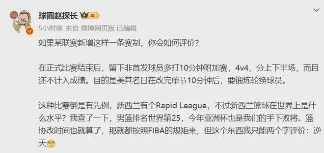 时间的缩短,利于增加比赛的紧凑激烈程度,但留给本土球员尤其年轻人发挥的机会可能随之变少。所以据国内知名媒体人爆料,CBA新赛季准备在正式比赛结束后,提供10分钟的时间用于两队的非首发球员PK,且不计入成绩。简单来说,本来一场比赛打4节,现在要打5节...... CBA终究不同于NBA,人家才是纯粹的商业联盟,我们的联赛则要更多为国家队服务,近年来的种种举措都是为了更好为中国男篮输送人才,接下来最主要目标莫过于顺利拿到2027年世界杯的参赛名额。