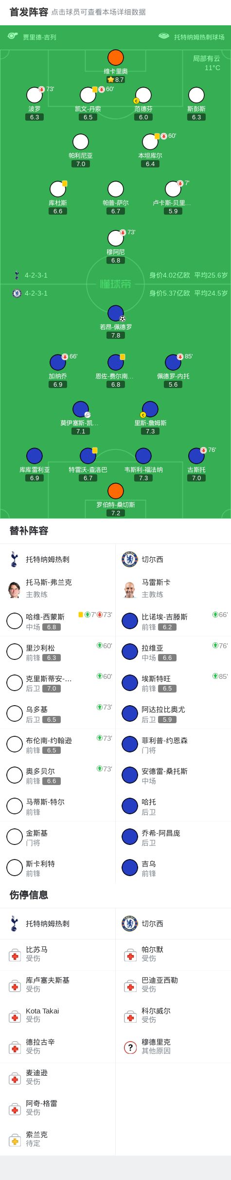 北京时间11月2日,英格兰足球超级联赛第10轮,托特纳姆热刺主场迎战切尔西。上半场,凯塞多抢断后助攻,若昂-佩德罗破门。下半场最后时刻,吉滕斯和若昂-佩德罗相继错失良机。全场比赛结束,切尔西1-0客场击败热刺。关键事件